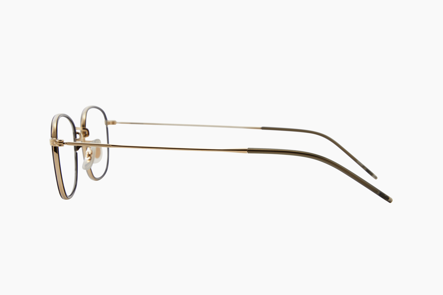 <GwGS(ゴールド/グレーササ)>は、レンズの周辺部に透明感のあるマーブルグレーのプラスチックパーツ(ウィンザーリム)を施したクールで上品なコンビネーションフレームです。ベーシックなゴールドメッキにはツヤを残し有機質なウィンザーリムとのコントラストが非常に美しい仕上がりとなりました。