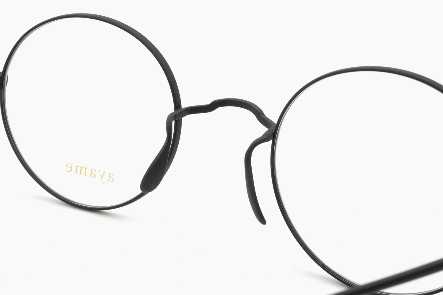 「R.M.」は、ayameが独自の構造として定番展開しているブリッジとノーズパッドが一体となった「マンレイ山」をベースに、ayameとContinuerが馴染む「ラウンド」を追求したモデル。「ROUNDED MANRAY」と名付けられたこのラウンド型は、顔馴染みに影響を与える「シェイプ」「サイズ」「智元の位置」などを0.5ミリ単位で調整を重ね完成。カラー展開も「ゴールド」「チタン無垢(シルバー)」とayameらしいオーセンティックなカラーに加え、Continuerのシグネチャーカラーになりつつある「ブロンズ」、そして新たに「マットブラック」登場し4色展開。