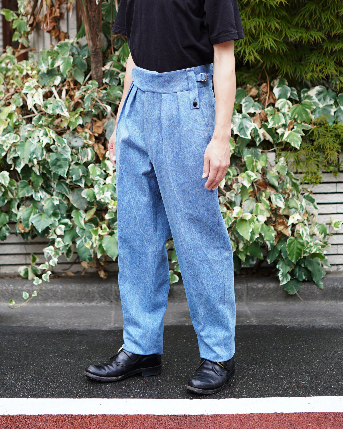 2022AWコレクション。今シーズンのデニム生地は90年代のアメリカデニムを再現した生地を使用。元々リジッドのインディゴデニムを極限までブリーチし、色落ちを表現。英国軍のオフィサートラウザーズがベースとなっているミリタリー色の色濃い人気型、「ベルトレス」と本生地を合わせ、あえてアンバランスな印象に仕上げています。独特な色合いの生地が映える今期おすすめのモデルです。