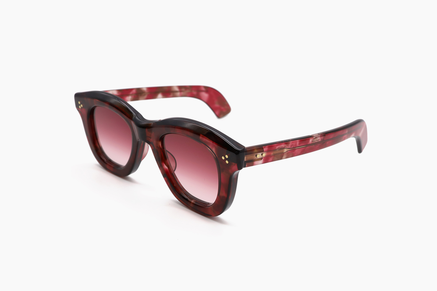 「RUBY ROUGE」は当時のルビールージュのカラーを再現する為、特注でオーダーしたカラー。鮮やかで抑揚のある鼈甲柄が特徴的なフレームと相性良く、ブランドらしさを存分に楽しめるカラーリングです。グラデーションレンズを合わせることで新鮮な趣のサングラスに。