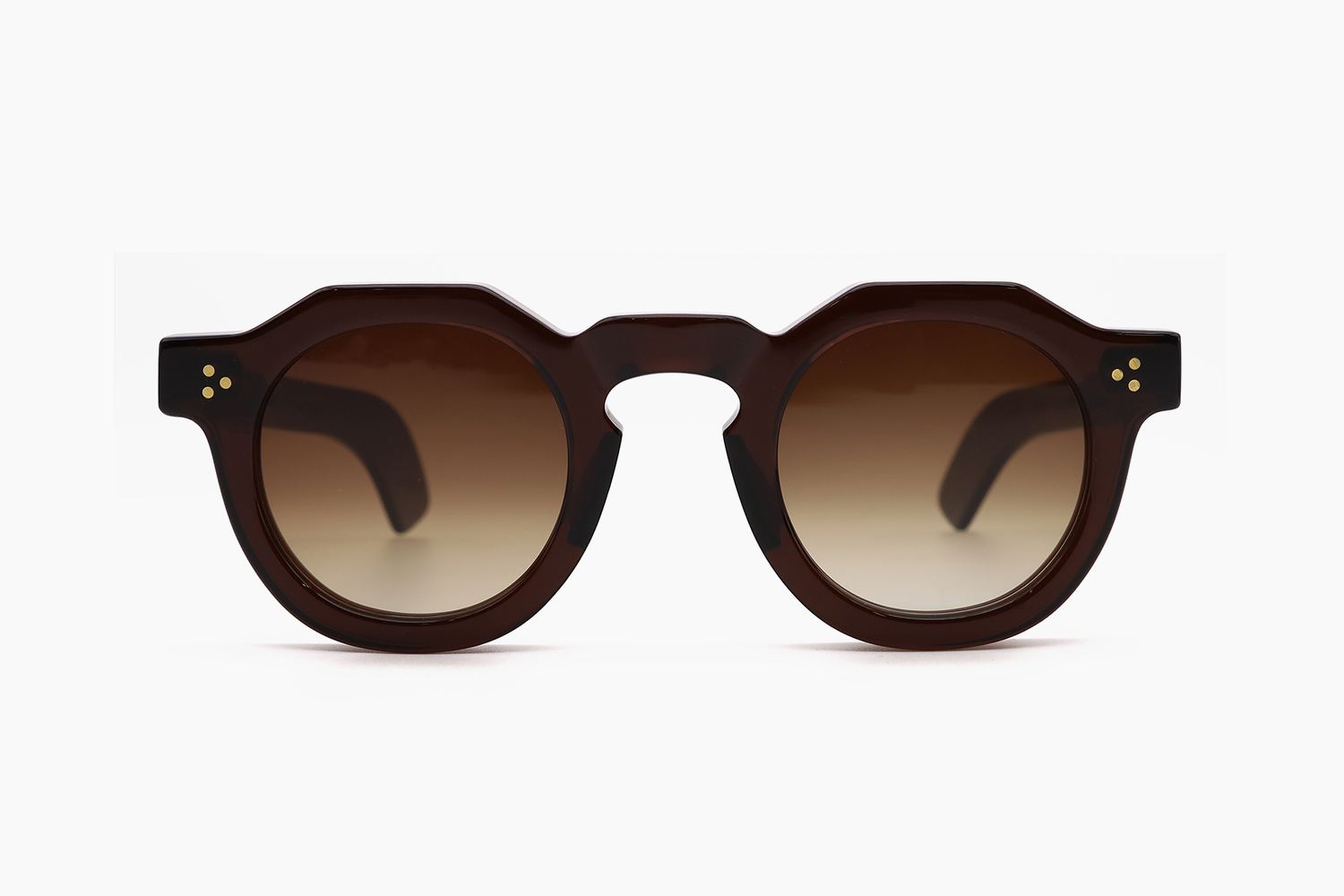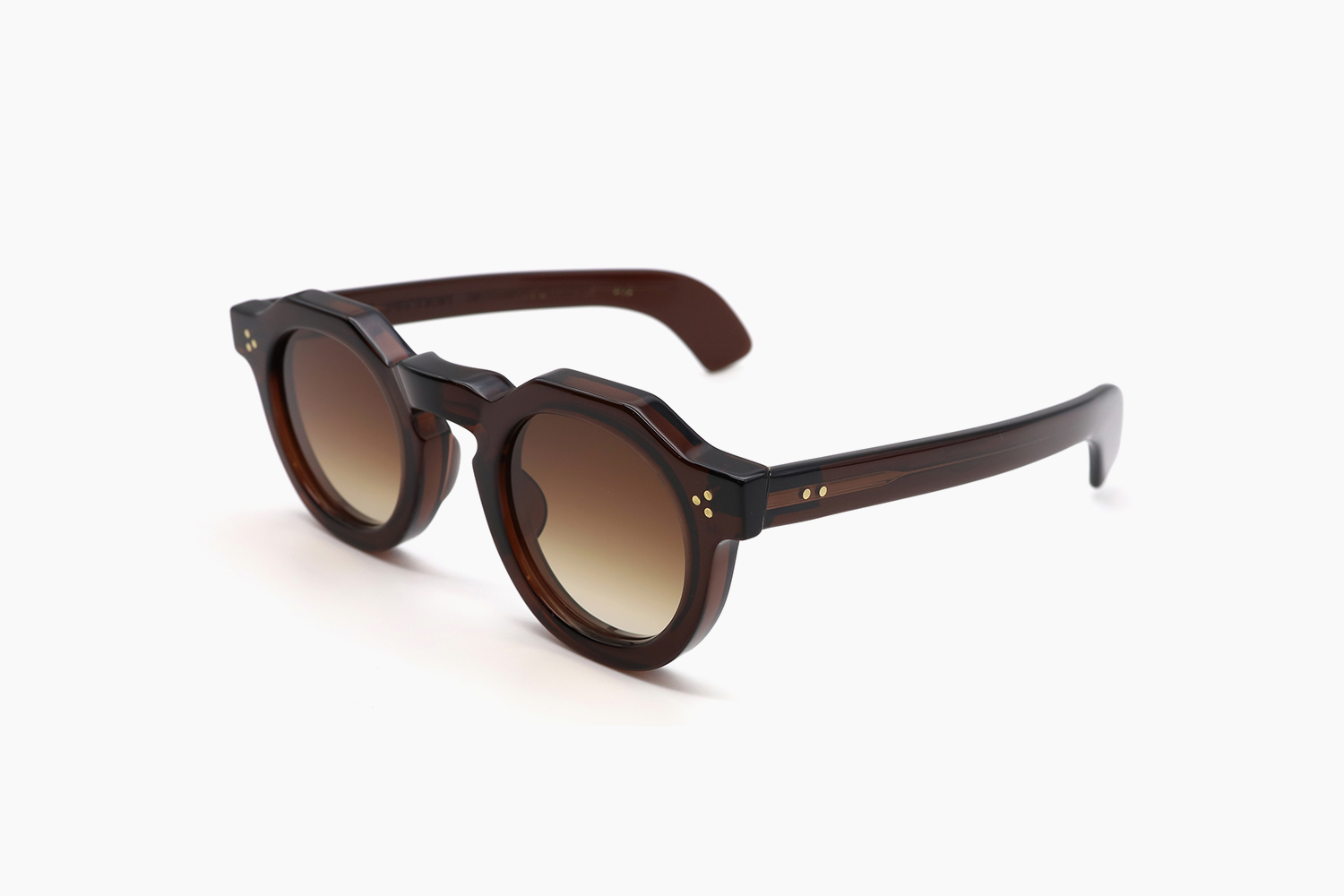 「CINNAMON」は厚みのあるクリアブラウンの生地が落ち着いた印象で重たくなりすぎず、顔馴染みの良いカラー。グラデーションレンズを合わせることで新鮮な趣のサングラスに。