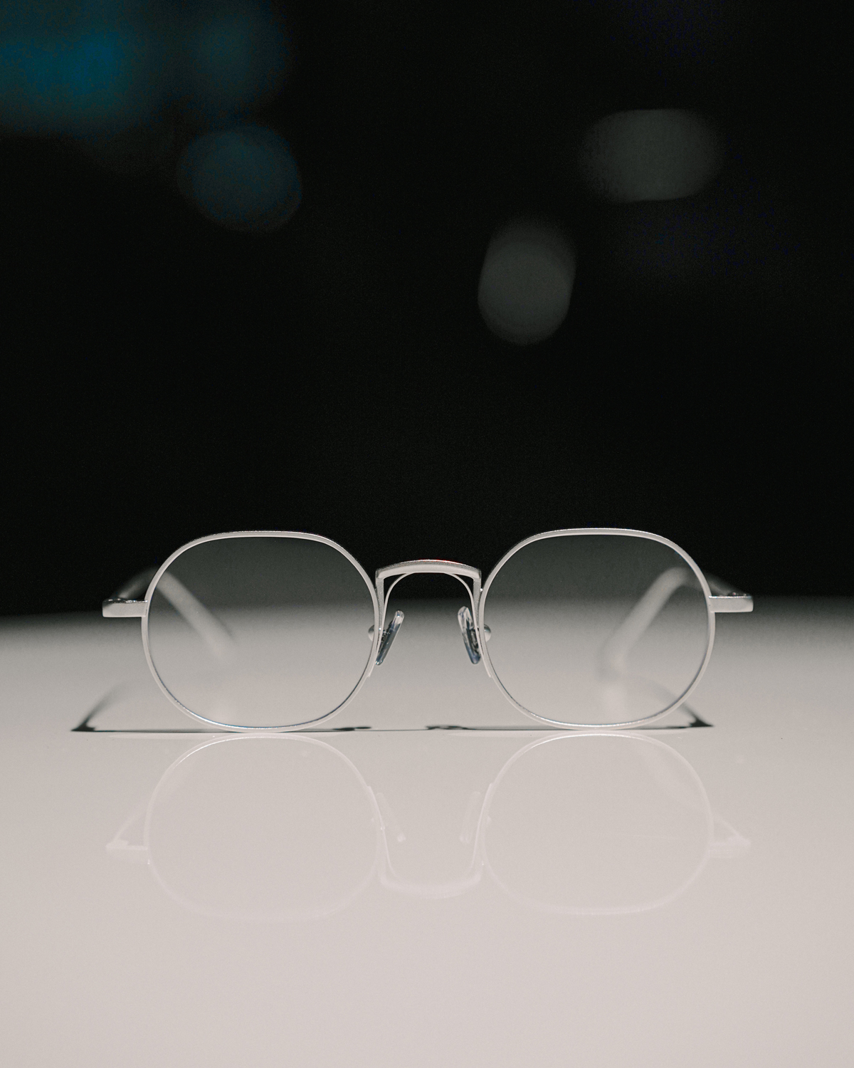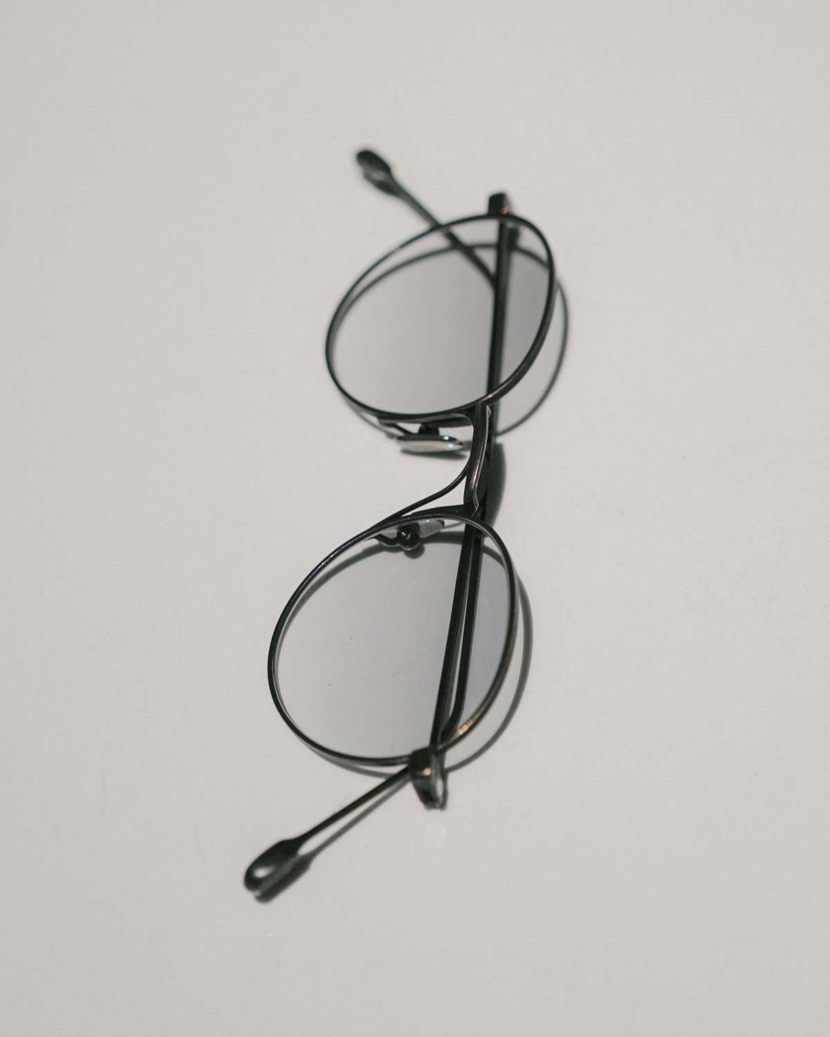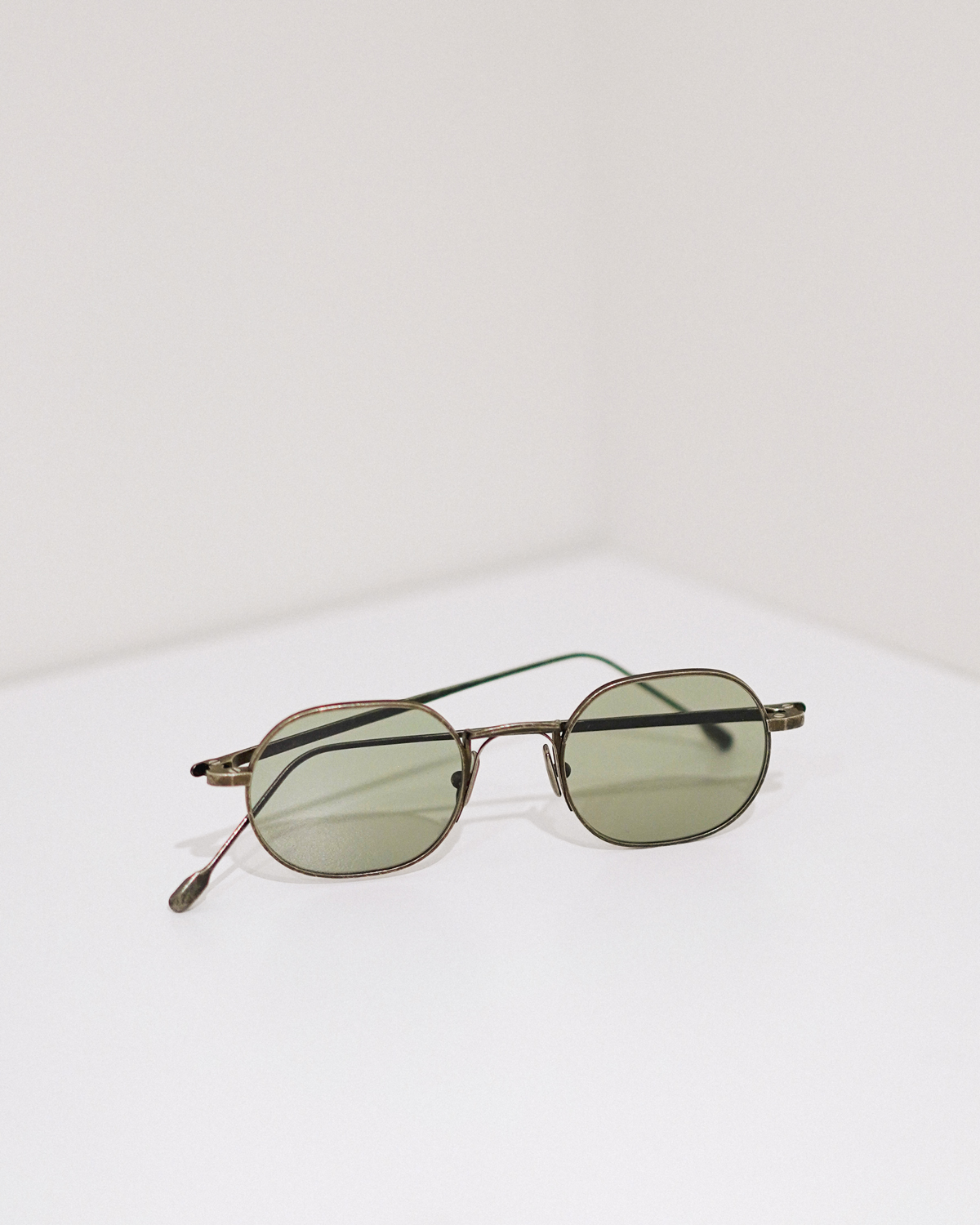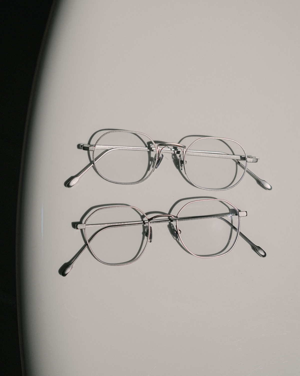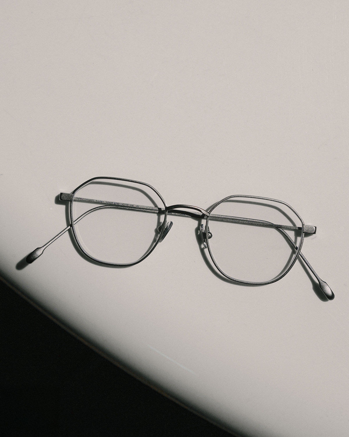 新作のメタルフレーム「blake」。やや横長のオーバルシェイプを現在のトレンドとも異なる縦幅と適度なワイド、独自のブリッジデザインやディテールで表現。〈lazare studio〉特有のカラーリング、質感と合わさり、細身のメタルフレームに独特な存在感を与えています。