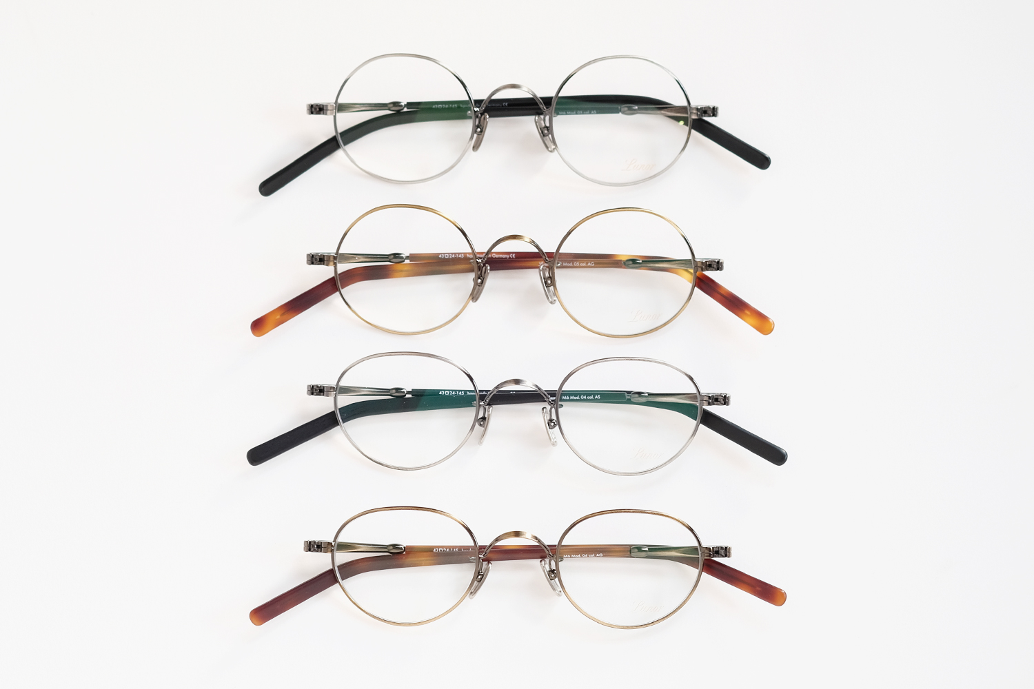 上記M5シリーズのテンプルにアセテートを組み合わせたシリーズ。現在は、パントゥの「mod.04」とラウンドの「mod.05」で展開。マットカラーのアセテート生地との組み合わせは、クラシカルでありながらも、どこかモダンな印象を与えます。▼