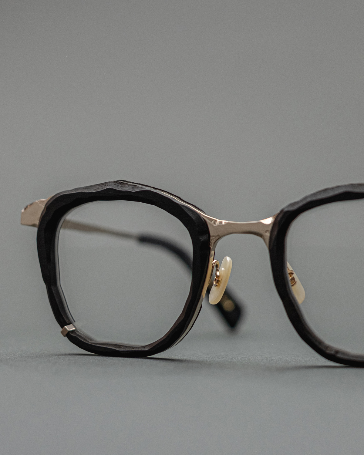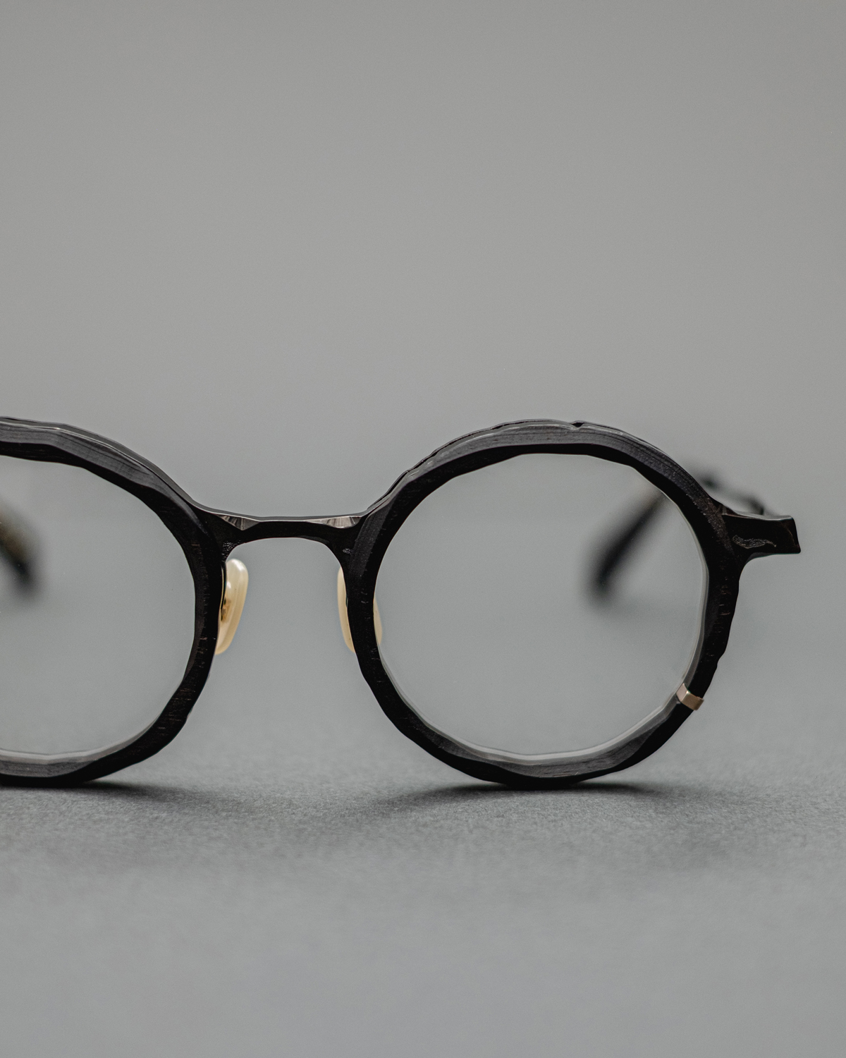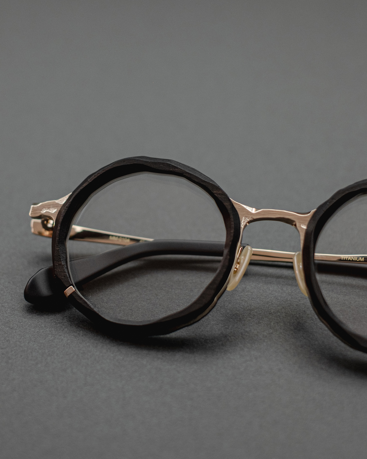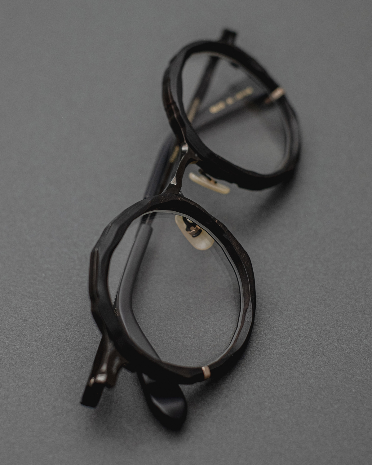 新たに発表された、稀少な天然素材・⿊檀 / Ebonyを⽤いた特別モデル。⿊檀は古くから楽器や家具などに使⽤される素材として珍重されてきました。その独特の質感が⽣み出す深く艶やかな⾊合いは、単なる⿊とは異なり、天然⽊ならではの複層的な表情と重厚な存在感を放ちます。今回、この特別なモデルに落とし込まれたコンセプトは〈sculpt〉。メタルと天然⽊の組み合わせに、ブランドの掲げるテーマ〈unfinished art〉にも通じるランダムな切削痕を思わせる造形が施されています。⽴体感と複雑性を増し、上品な佇まいのフレームに荒々しい表情を添え、⿊檀という素材の存在感を⼀層際⽴たせる表現は丸山氏ならではのアプローチ。特徴的なデザインと、顔馴染みの良いサイズバランス。そこに⽇本の職⼈による精緻なものづくりが重なることで、デザイン性と実⽤性を⾼い次元で両⽴したアイウェアに仕上がっています。
