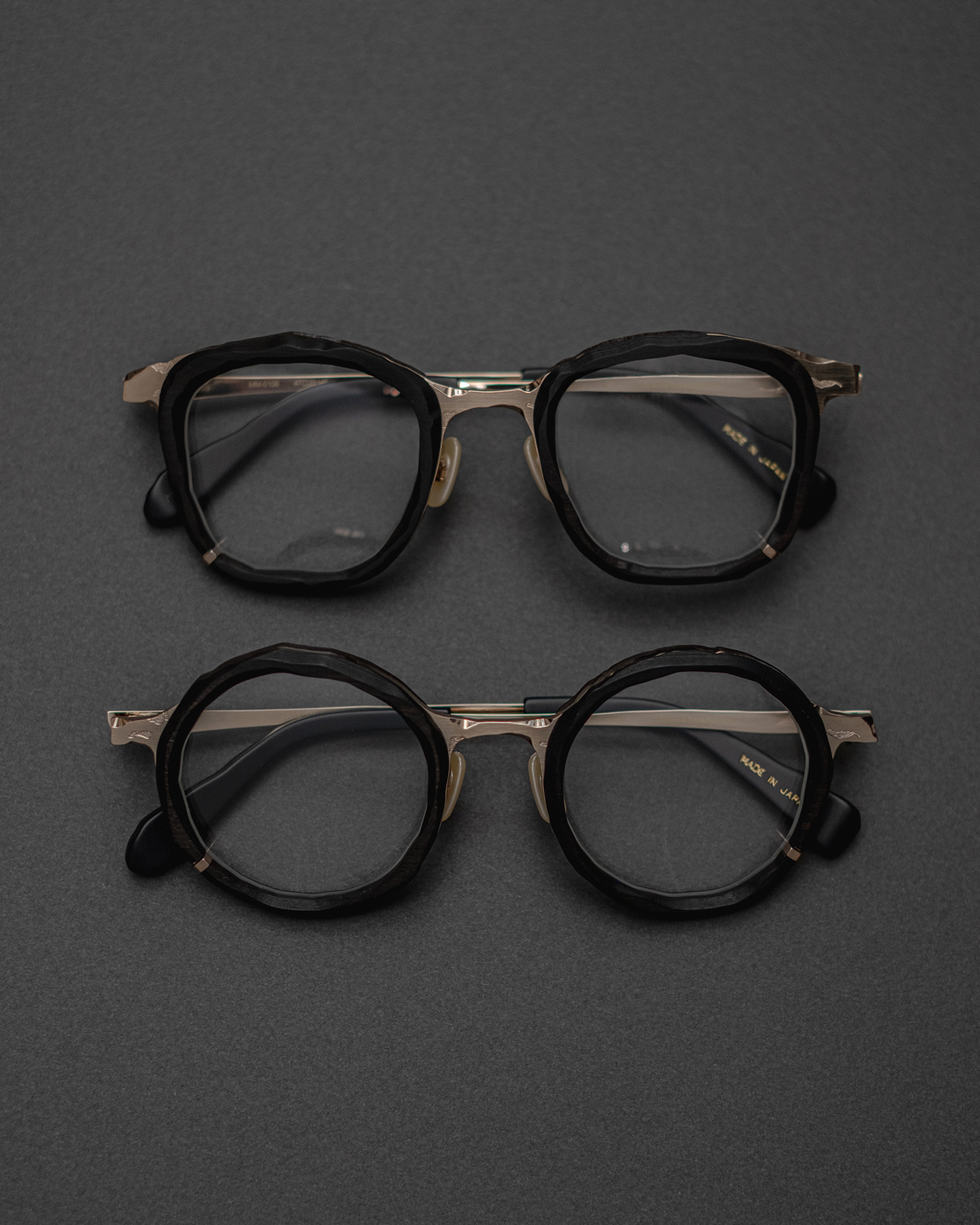展開はラウンドシェイプとウェリントンシェイプの2型。⿊檀にゴールドを合わせたカラー「S1」は、コンビネーションフレームらしく⽬元に華やかさをプラスしつつ⿊檀の質感が際⽴つ、ブランドが提案する王道のカラー。また、⿊檀の⿊とは異なるシャーリングされたブラックメタルを組み合わせ、 より奥⾏きの感じられるカラー「S2」はシックかつモードな雰囲気を醸すブラック。