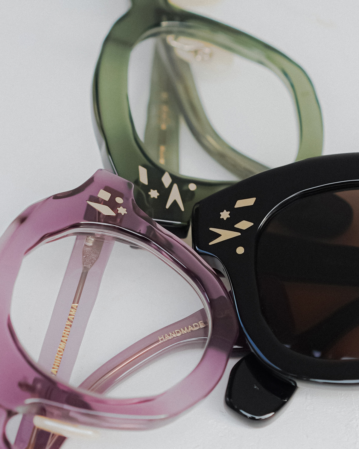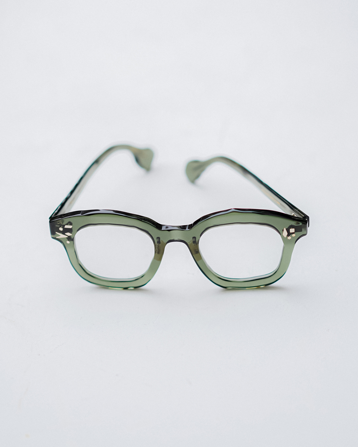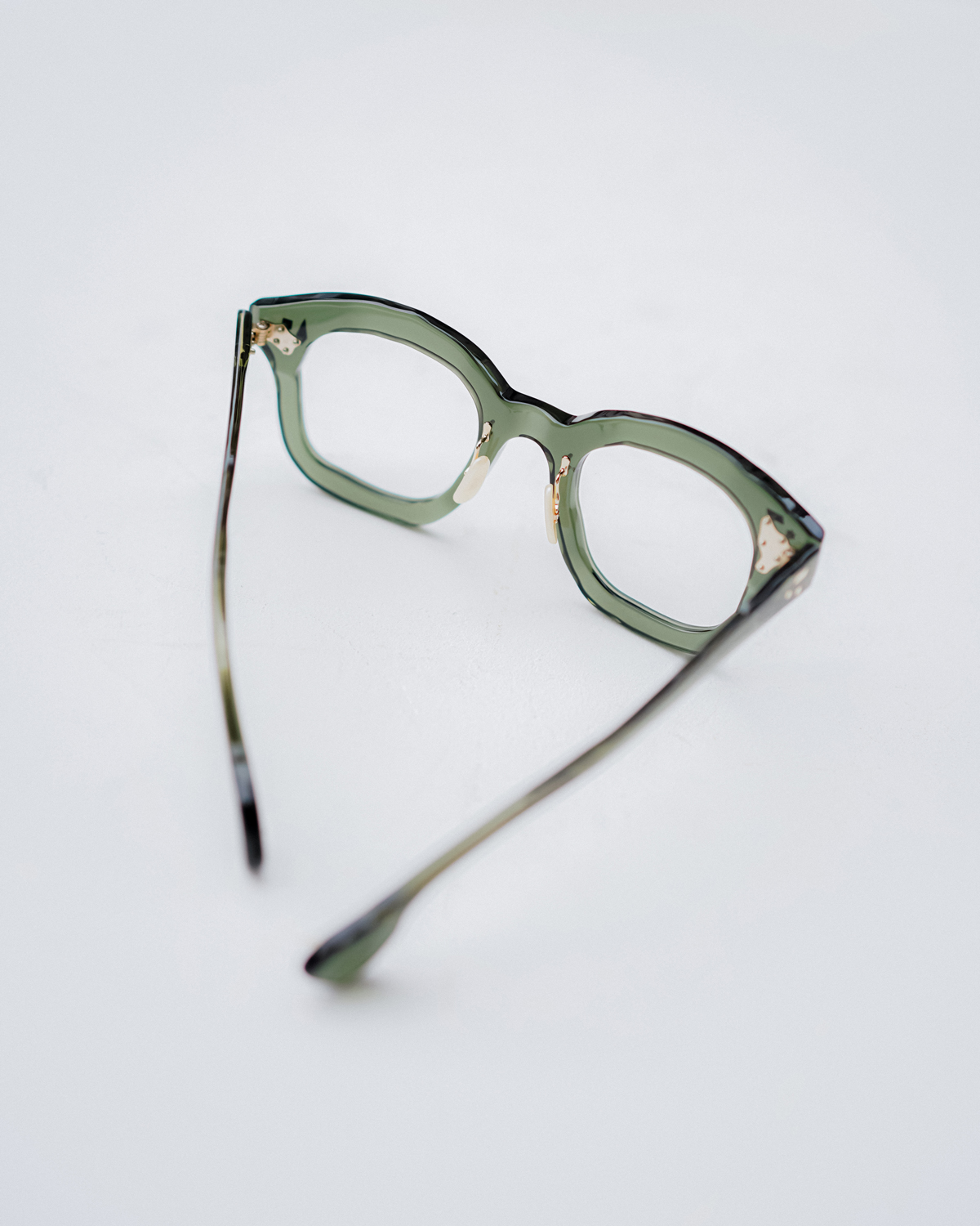 本コンセプト初となるモデルは、複数のカシメをランダムに配したユニークなセルモデル。色合いも定番カラーからヘルシーなグリーンなど華やかな印象のカラーもラインナップし、サングラスレンズにはドイツのカールツァイス社製のレンズを採用しています。また、カシメのディテールは飾りではなく、実際にしっかりとカシメられており、ブランドの魅力の一つともいえる複雑なデザインを日常的なアイウェアとして形にするクオリティの高さは健在です。