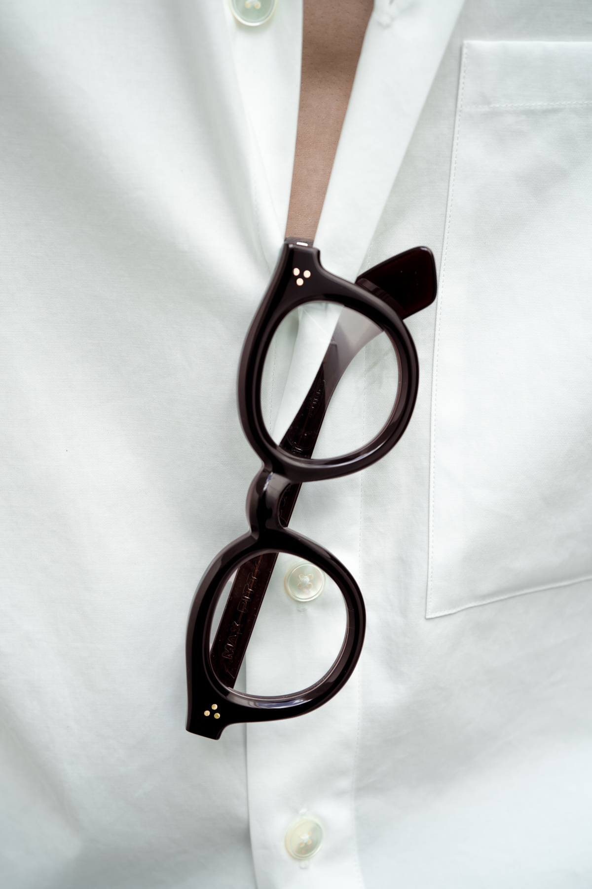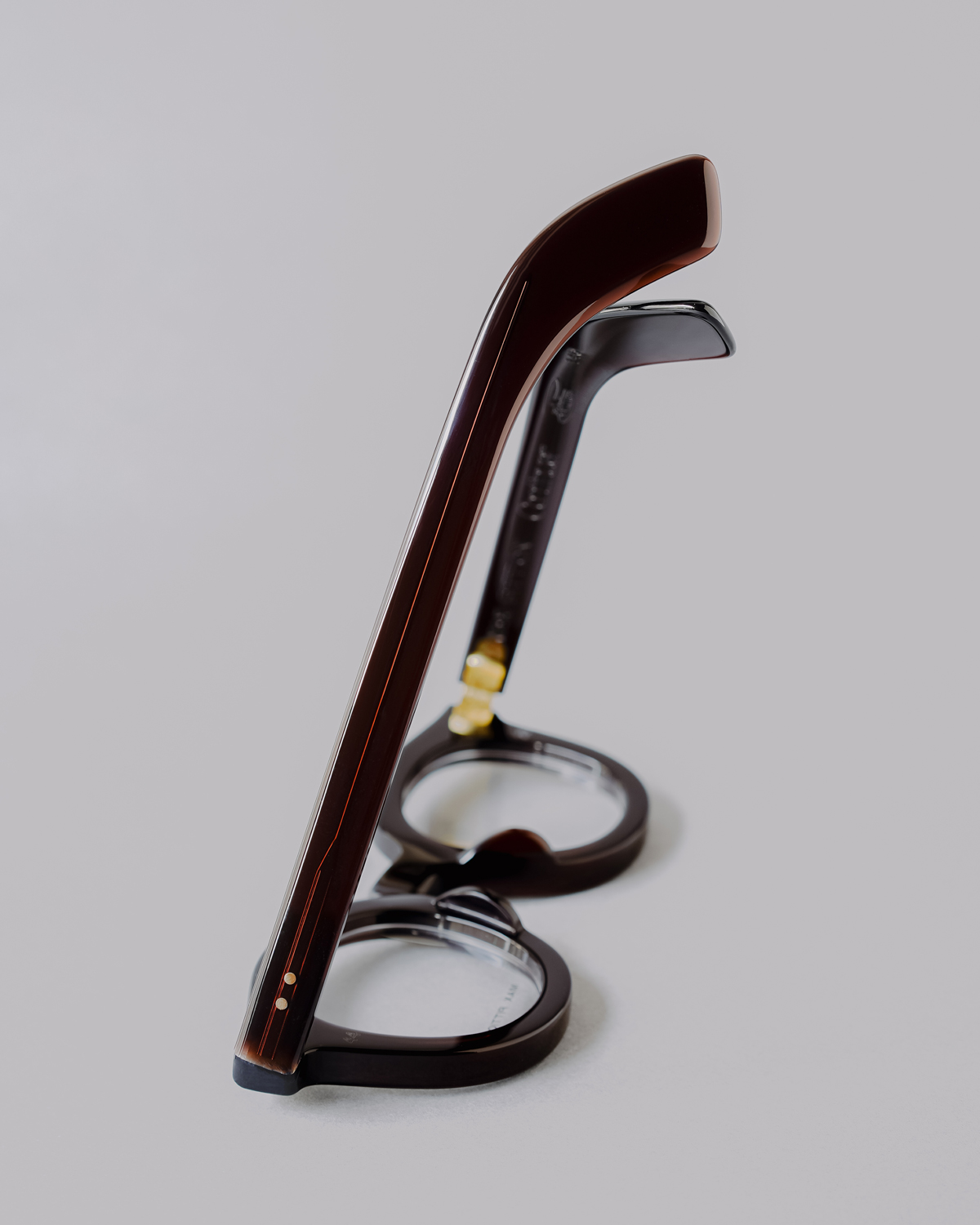 新たな別注色となる 「DEEP BROWN」 は黒に限りなく近いブラウンを採用し、シンプルなブラックとは異なる奥行きとニュアンスを宿したカラーです。光が当たることで静かに浮かび上がる深い色合いは、落ち着きのあるクラシックな印象を保ちながら、強さだけに寄らない柔らかな品格を感じさせます。ほどよく彩度を含んだワイドテンプルはブラックに比べて顔に馴染みやすく、太セルのボリュームをより自然に楽しめるのも魅力的です。続いて、発売後すぐに完売となった「SLATE GRAY」が再発売となります。クラシカルなグレーのムードを基調に、フレーム全体に柔らかな透明感を帯びさせることで、太セルの存在感と抜けのある佇まいが同居するカラー。軽やかさと深みの両方を備え、前回のリリース時にも多くの反響をいただいたモデルとなります。